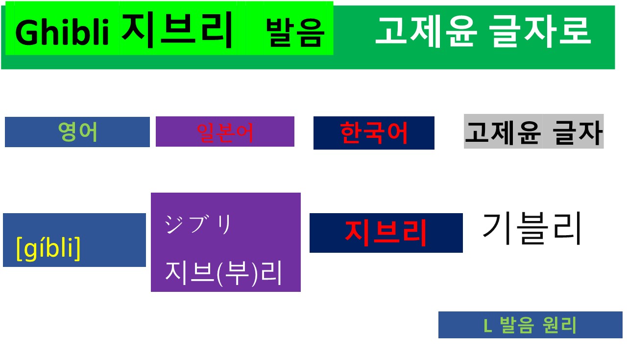 * 오늘은 GHIBLI라는 발음에서 일본인들의 발음 원리를 중심으로 살펴보았습니다. 일본의 회사 이름이기에 GHIBLI를 '지브(부)리'로 발음한다고 틀린 것은 아닐 것입니다. 다만 GHIBLI에서 어떤 원리로 일본인들이 외국어 발음을 이해하는지의 좋은 사례가 될 것입니다.우리말에 일본을 거쳐 온 많은 외국어도 이러한 일본어 원리를 적용하여 온 경우를 볼 수 있습니다.