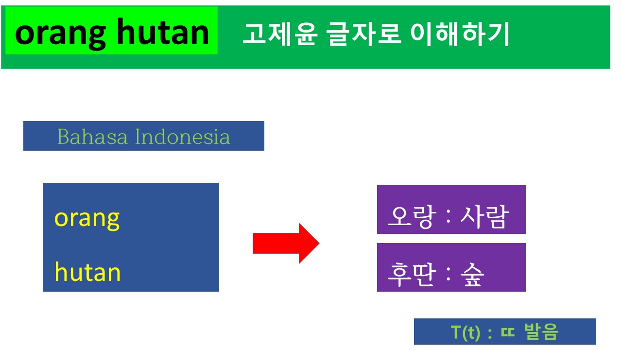 인도네시아어에서 'hutan'은 '숲'을 의미합니다. 인도네시아어에서 t는 한글에서는 쌍디귿 소리로 볼 수 있습니다. 영어에서는 t가 한국어 'ㅌ'소리이지만 인도네시아어에서는 'ㄸ'소리에 가깝습니다. 한국어에서 보통 경음이라고 표현하는 소리들이 인도네시아어에서는 기본음입니다.