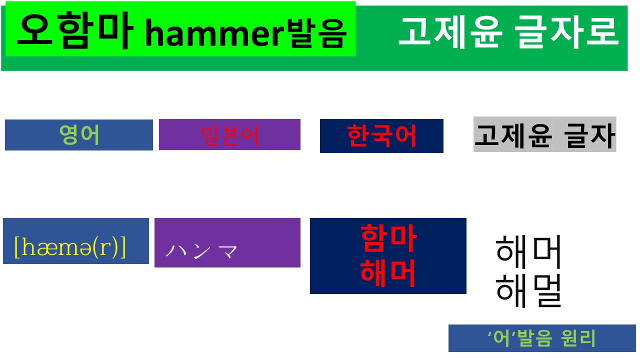 영어의 발음 원리를 알고 계신분들은 대부분 hammer의 발음이 '해머'아니야?라는 의문을 가질 것입니다. 선뜻 이해하기 어려운 '해머'와 '함마' 발음의 차이로 생각하실 것입니다. '큰'을 의미하는 '오오'는 일본어 표현이라고 하더라도, '함마' 발음이 어떻게 가능하지 하는 의문일 것입니다.