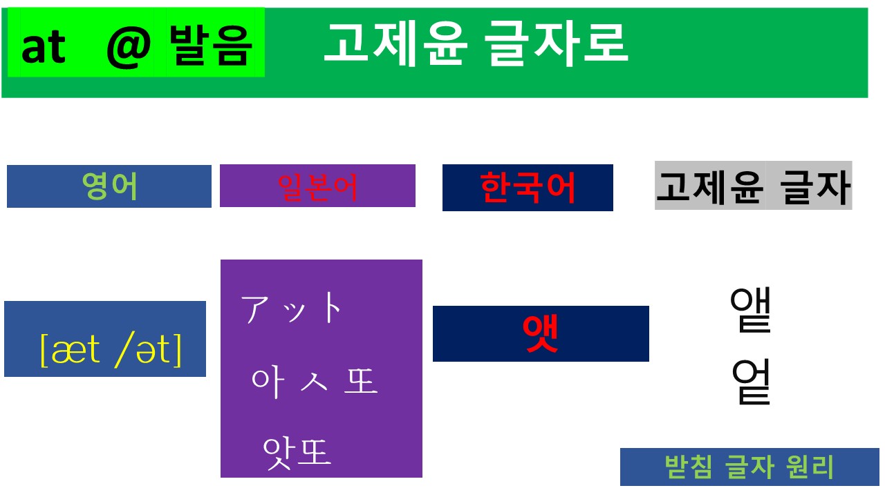 * 'at'이라는 표현에서 볼 수 있듯이 우리의 훈민정음 표기를 사용하면 세상의 모든 소리를 그대로 표기할 수 있습니다. 훈민정음이 지닌 놀라운 과학적 언어 표현 원리입니다. 일본어 발음의 원리와 비교해 보시면 충분히 이해하실 수 있을 것입니다.