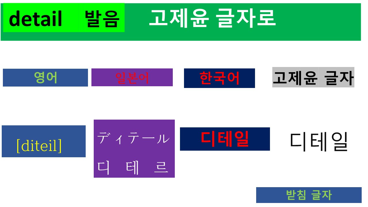 영어 단어 detail을 발음 기호로 표현하면 [diteil]입니다. 가로 쓰기로 되어있는 발음을 훈민정음을 활용한 "고제윤 글자"로 표현하면 '디테일'입니다. 현재의 한글 입력 키보드로도 정확히 표현할 수 있는 소리입니다. 또한 더하거나 빼는 것 없이 각각의 소리에 맞추어 완벽하게 표현할 수 있습니다.