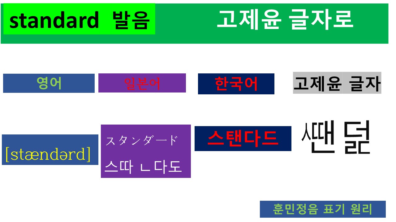 Standard를 발음 기호로 표현하면 [ stændərd ]입니다. 이 발음을 훈민정음을 활용한 "고제윤 글자"로 표기하는 원리는 다음과 같습니다.