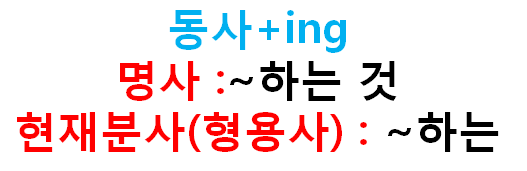 동사에 'ing'가 붙은 형태 중에서 가장 많이 혼동하는 경우가 '동사+ing'가 현재분사(형용사)로 사용되는 경우입니다. 흔히 '진행형'이라는 의미로 "Ing야"와 같은 용어를 사용하는 것을 볼 수 있습니다. 이때 "Ing야"라는 의미는 '진행 중이야."를 의미하는 것을 볼 수 있습니다. 물론 틀린 말은 아니지만 동사에 'ing'가 붙는다고 반드시 '진행형'을 나타내는 것이 아닙니다. 그보다는 동명사의 형태로 쓰이는 것이 더 많기 때문에 'Ing'를 반드시 진행형과 연관시키는 것은 무리가 있습니다.