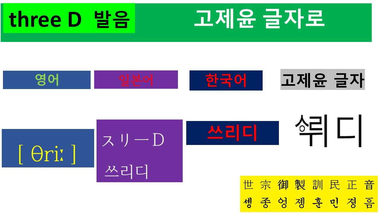 숫자 3을 의미하는 three를 발음 기호로 표현하면 [ θriː ]입니다. 이들 소리를 훈민정음을 활용한 "고제윤 글자"로 표기하면 다음과 같습니다.