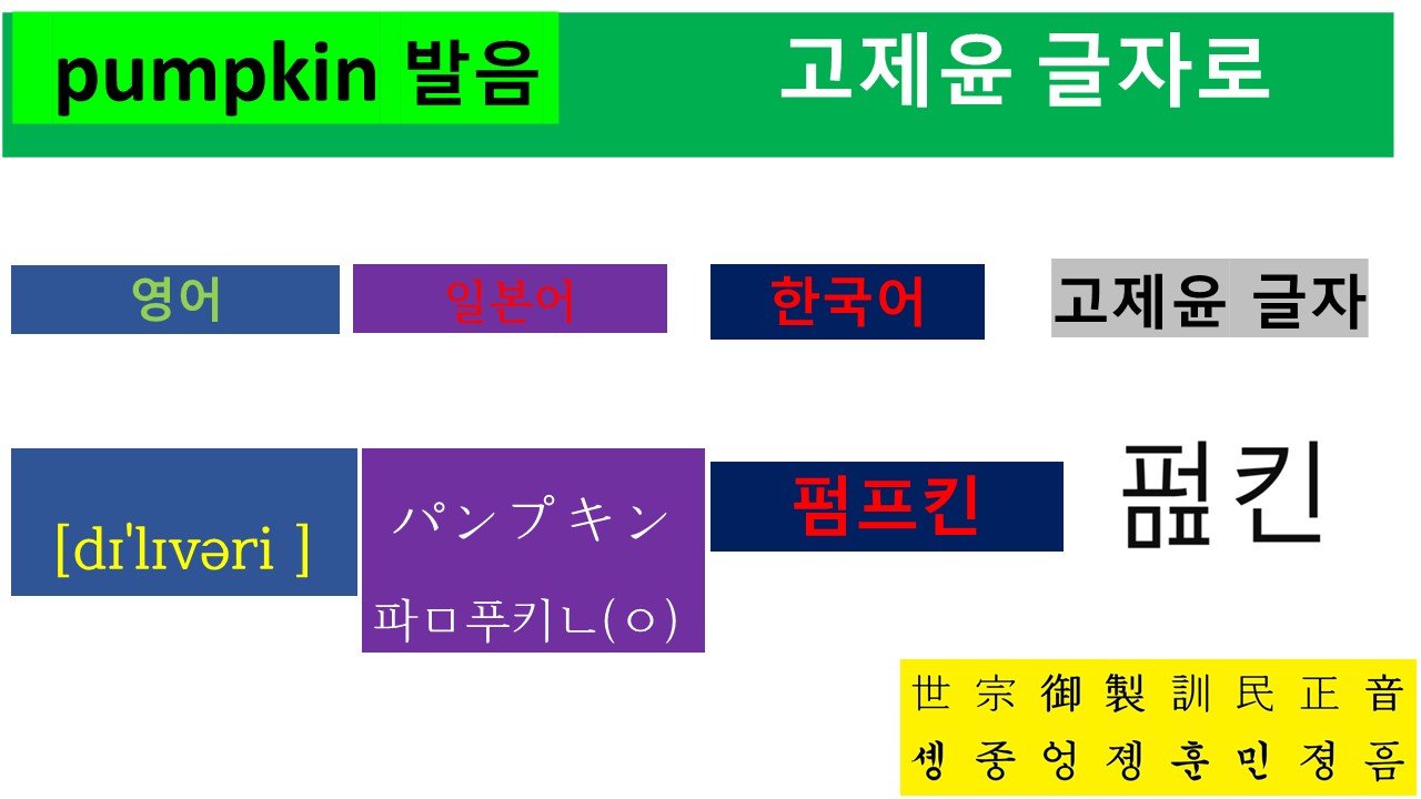 호박에 해당하는 영어 단어 pumpkin을 발음 기호로 표현하면 [ pʌmpkɪn]입니다. 알파벳과 발음 기호 모두 가로 쓰기의 음소 배열이므로 한글로 같은 방식으로 표현하면 [ㅍㅓㅁㅍㅋㅣㄴ]입니다. 각각의 소리를 훈민정음의 글자 원리를 활용한 "고제윤 글자"로 표현하면 위의 맨 오른쪽 글자가 됩니다.