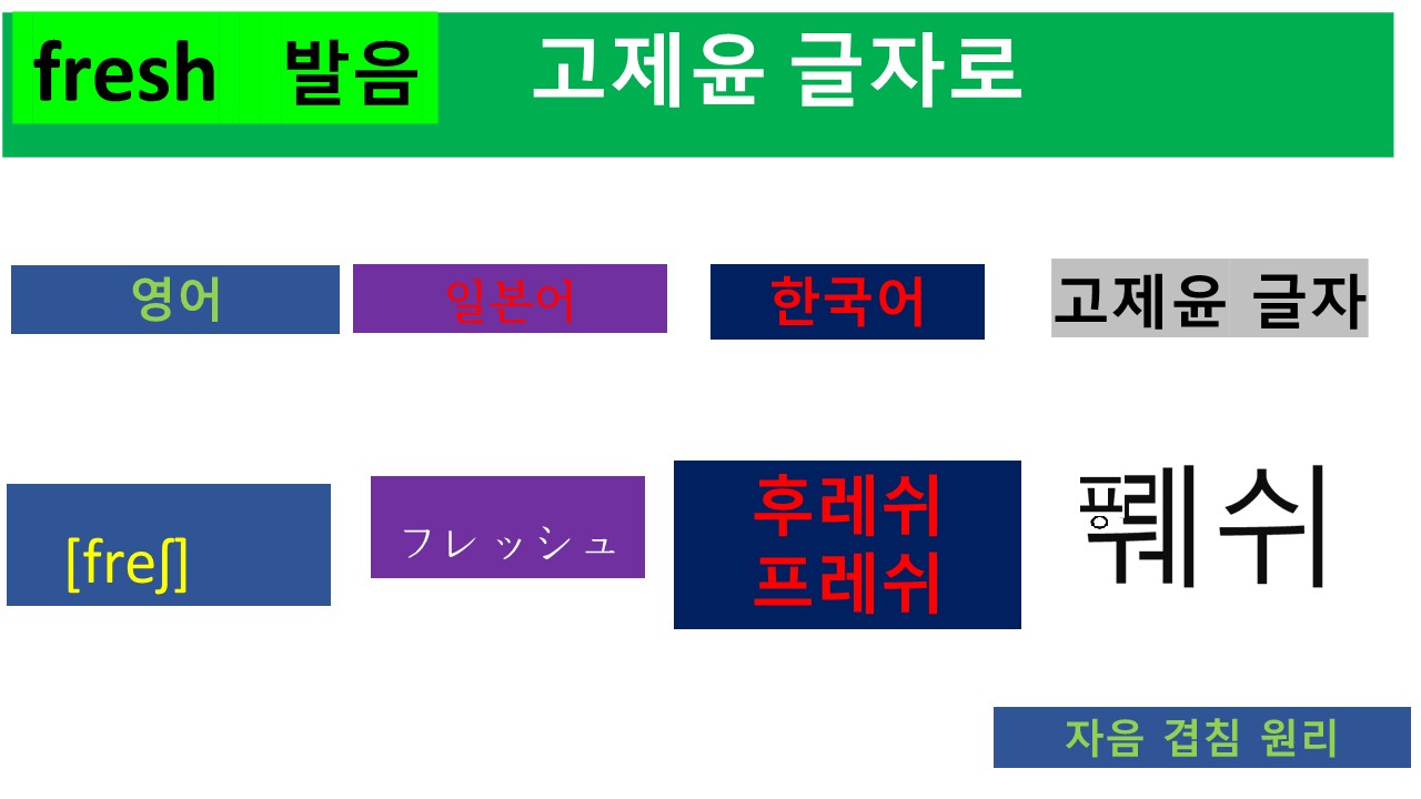 같은 원리로 위에서 제시한 fresh의 발음 역시 같은 원리가 적용됩니다. F소리를 일본어에서 '히읗'으로 표현하여 '후'발음을 하고 있고, 이 발음을 한국어에서는 '후레쉬'라고 일본어 발음을 흉내낸 것을 볼 수 있습니다.