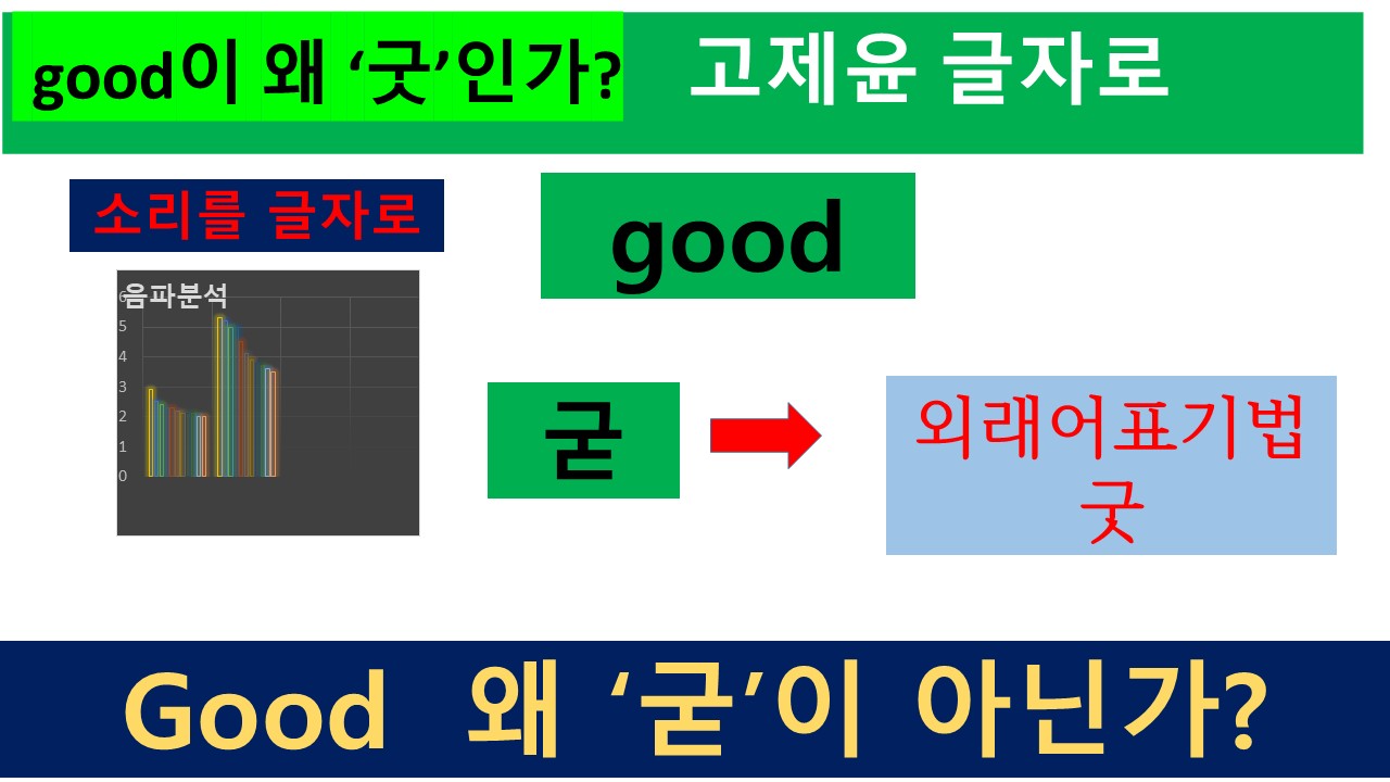 많은 분들이 의문을 갖는 영어 외래어 표기 중에서 good이 있습니다. 보통의 영어 지식을 갖춘 한국인들이라면 good는 '굳'이라고 생각할 것입니다. Good을 발음 기호로 표현하더라도 [ ɡʊd]이기에 '굳'이 맞다고 생각할 것입니다.