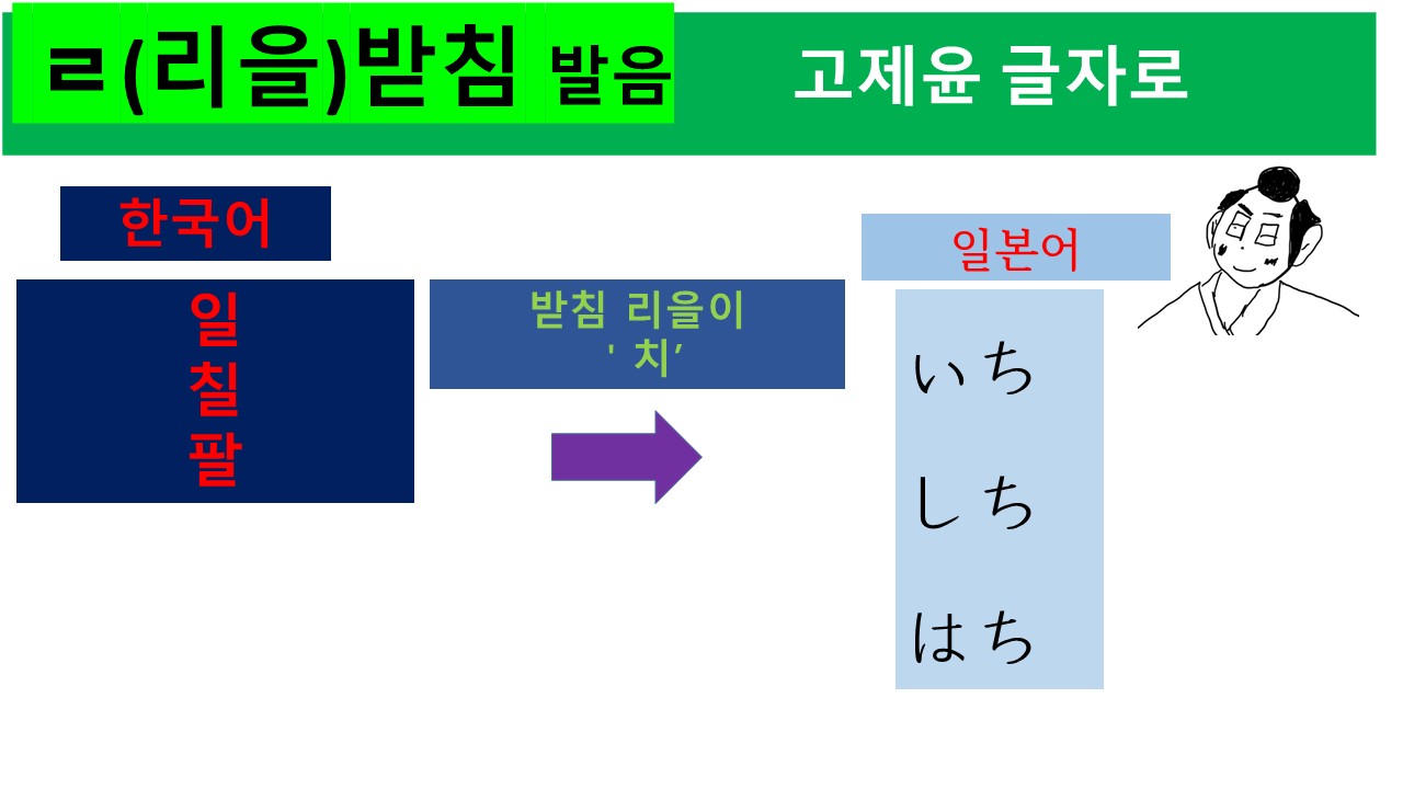 위의 동영상에서 설명한 것처럼 공통적인 받침 리을을 '치'발음으로 변경하는 원리를 '닐'에 적용하면 '니치'발음이 되는 것입니다. 겉으로 보기에는 전혀 다른 소리인 것처럼 보이지만 세종대왕의 훈민정음 창제 이전의 상황으로 일본어를 보면 그 본 모습이 보일 것입니다.