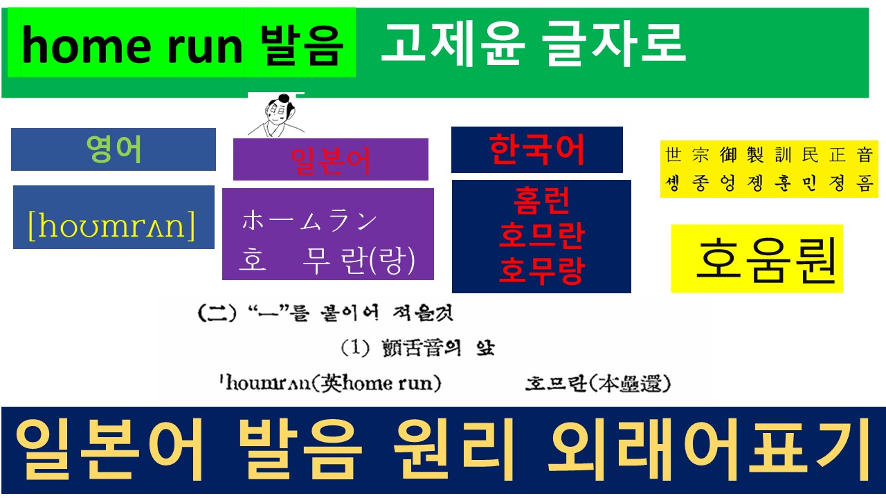 야구 경기의 발상지 답게 대부분의 야구 용어는 미국식 영어를 사용하고 있습니다. Home run을 미국식 발음 기호로 표현하면 [ hoʊmrʌn]입니다. 알파벳이나 발음 기호처럼 훈민정음을 활용한 "고제윤 글자"의 원리로 가로 쓰기로 표현하면 [ㅎ ㅗ ㅜㅁ루 ㅓㄴ]입니다. 이들 각각의 소리는 다음과 같습니다.