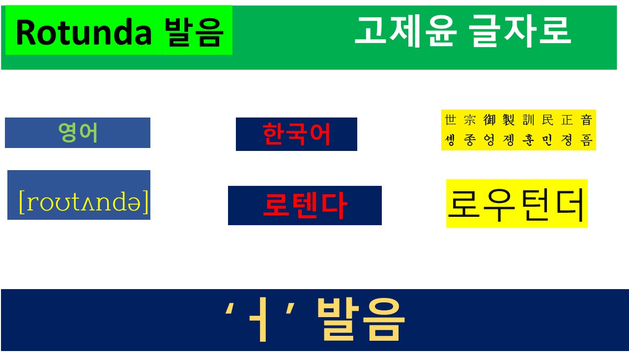 Rotunda를 영어 발음 기호로 표현하면 [roʊtʌndə]입니다. 알파벳이나 발음 기호처럼 한글 가로 쓰기로 표현하면 [ㄹㅗㅜㅌ ㅓㄴㄷ ㅓ]입니다. 훈민정음의 글자 원리로 각각의 음소를 음절로 배열하면 '로우턴더'와 같이 표현할 수 있습니다. 훈민정음을 활용한 "고제윤 글자"에서도 같은 글자로 표기하고 있습니다.