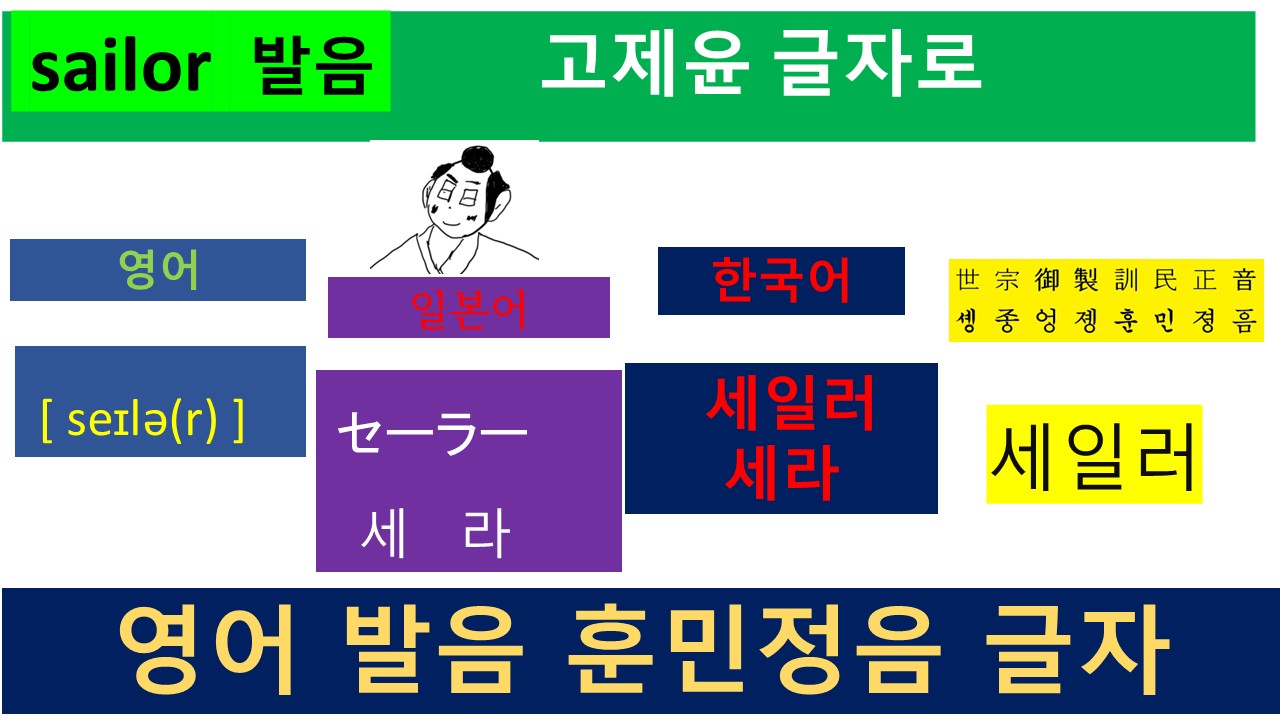 Sailor를 발음 기호로 표현하면 [ seɪlə(r) ]입니다. 알파벳이나 영어 발음 기호는 모두 음소의 가로 쓰기입니다. 각각의 소리를 훈민정음의 글자를 사용하여 가로 쓰기로 표현하면 [ㅅ ㅔ ㅣㄹㄹ ㅓ(ㄹ)]입니다. 훈민정음의 글자 원리로 표현하면 '세일러' 혹은 '세일럴'의 발음에 해당합니다. 훈민정음을 활용한 "고제윤 글자"에서도 '세일러'로 표기하고 있습니다.