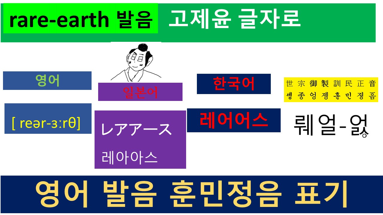 'rare'라는 단어는 한국어로는 '드문'이라는 의미로도 사용하지만, 요리에서는 '덜 익힌'의 의미를 갖습니다. 'Earth'는 흙, 지구, 토양 등의 의미를 가지며 이 두개의 단어를 발음 기호로 표현하면 [ reər-ɜːrθ]에 가까운 발음입니다. 이들 소리를 다음의 원리를 사용하여 훈민정음을 활용한 "고제윤 글자"로 발음 표기를 하였습니다.