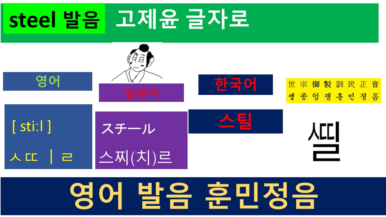 영어 단어 Steel을 발음 기호로 표현하면 [ stiːl ]입니다. 알파벳이나 발음 기호처럼 훈민정음의 음소를 가로 쓰기로 나타내면 [ㅅㄸ ㅣㄹ]로 표현할 수 있습니다. 영어 단어, 특히 미국식 영어에서는 s뒤의 't'발음이 우리말의 '쌍디귿'에 가까운 소리라는 점을 반영한 것입니다. 각각의 음소를 훈민정음을 활용한 "고제윤 글자"로 표기하면 위의 맨 오른쪽 글자와 같이 나타낼 수 있습니다. 장음 표기는 제외하고 음소 만을 훈민정음의 글자 원리로 표현한 것입니다. Steel의 발음은 모음이 하나이므로, 한 번의 호흡으로 발음하는 소리입니다. 1음절의 단어라는 의미입니다. 1음절의 단어이므로 한 번의 소리 호흡이 이뤄지고 세종대왕은 이러한 소리 호흡에 맞춰 하나의 글자로 표기하는 방식을 제시한 것입니다.