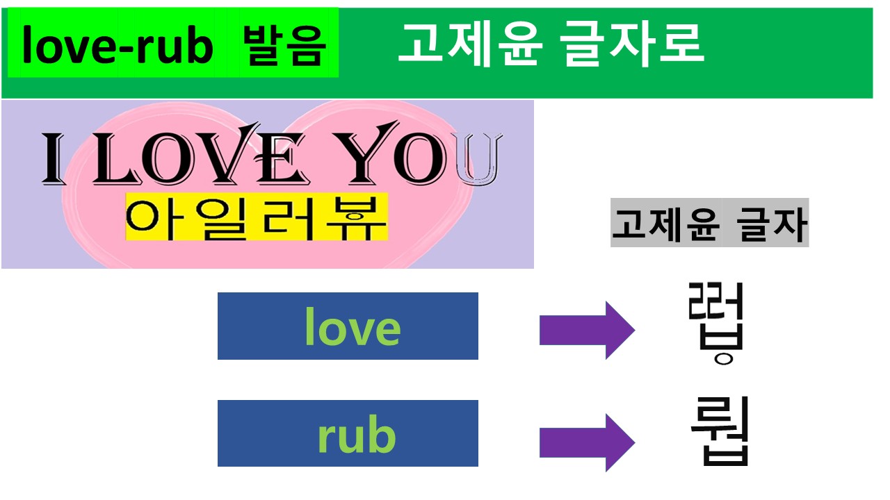 광고에서 '리튼'이 아닌 '뤼튼'으로 발음하듯이 r발음에는 '루'혹은 '로'를 넣어서 나타낼 수 있습니다. 위의 표에서 볼 수 있듯이 rub의 발음을 '뤕'발음을 훈민정음을 활용한 "고제윤 글자"에서는 '뤕'로 표현하였습니다. Love와 rub는 둘 다 한국인들에게는 '러브'의 발음으로 이해하는 것을 볼 수 있지만, 이러한 표기 원리로 다른 소리와 다른 글자로 표기할 수 있습니다.