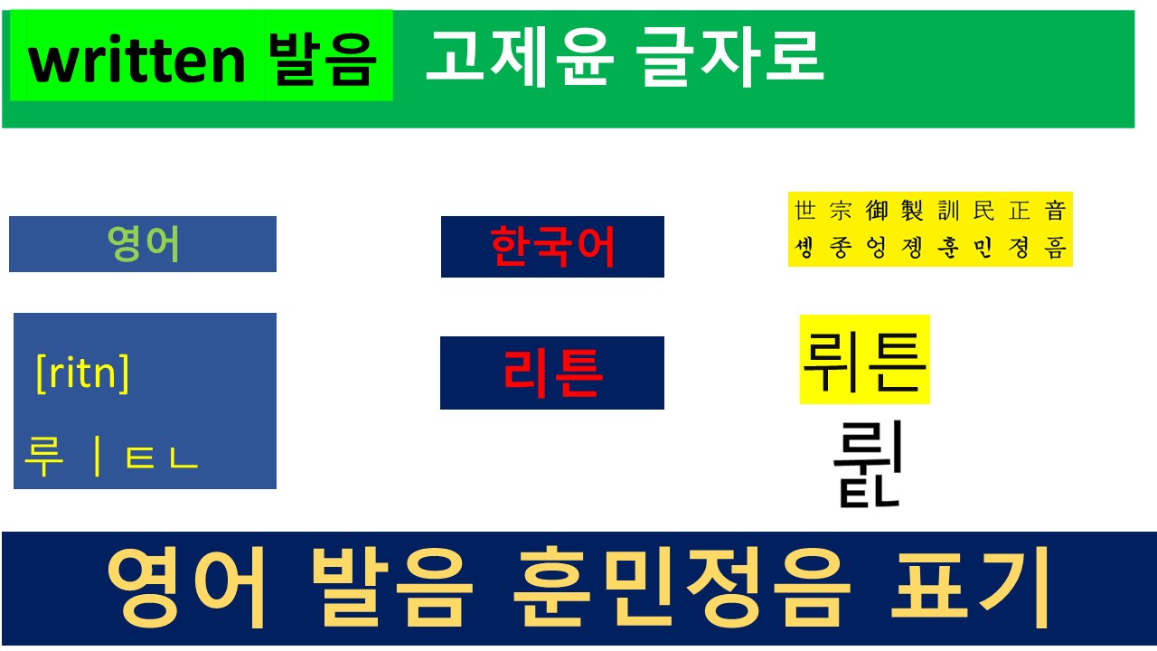 Written을 발음 기호로 표현하면 [ritn]입니다. 반모음인 w의 발음이 약화하면서 'r'로 시작하는 소리로 나타납니다. 알파벳이나 훈민정음은 음소를 단순히 단 하나의 원칙인 가로 쓰기로 표현합니다. 이 방식으로 훈민정음의 소리 표기를 나타내면 '루 ㅣ ㅌ ㄴ'이 됩니다. 엄밀하게는 티읕과 니은이 겹치는 받침 표기 원리로 나타내는 방식이지만 훈민정음을 활용한 "고제윤 글자"에서는 가독성을 위해 '뤼튼'으로 표기합니다. 영어에는 없는 'ㅡ' 모음을 사용하여 자음이 겹치는 경우에 표현하기도 합니다.