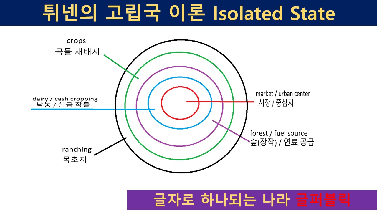 2) 동심원적 토지 이용 : 원 모양으로 띠를 이루어 농업 생산물이 생산들고, 중심 도시에 가까울수록 운송비가 적게드는 대신에 노동력이나 자본을 더 많이 투자해야하고, 멀어질수록 토지를 더 넓게 쓰는 농업을 한다.
