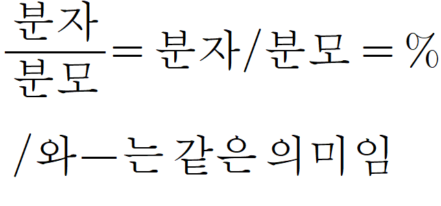 먼저 이해할 부분은 분자/분모처럼 가로로 쓰건 위의 식에서 분자를 위에, 분모를 아래에 쓰는 방식이건 그 내용은 같다는 것입니다. 분자 분모를 수평선을 기준으로 위아래로 나누어 쓰는 방식은 많은 공간을 차지하기 때문에 오늘날 인터넷 환경에서는 자주 사용되지 않습니다. 위에서 처럼 도표로 분자 분모를 위아래로 쓰는 방식을 나타낸 것도 컴퓨터 환경에서는 표현이 적합지 않기 때문에 위의 도표로 모양을 보인 것입니다.
