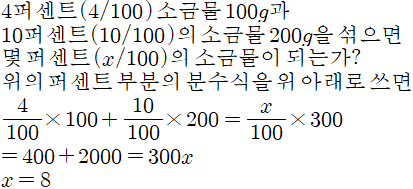위의 계산식은 4퍼센트(4/100)의 소금물 100g과 10퍼센트(10/100)의 소금물 200g을 섞으면, 몇 %( x/100)의 소금물이 되는가를 위아래 분수식으로 계산한 것입니다. 위의 문제 풀이 과정을 통해서 볼 수 있듯이 퍼센트라는 말을 '/100'으로만 바꾸어 계산하면 됩니다.