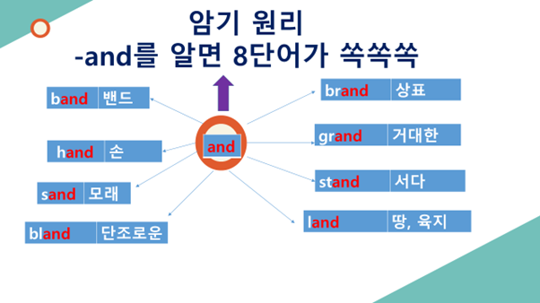 그럼에도 불구하고, 알파벳의 일정한 소리 배열을 놓고 보면, 규칙성이 존재합니다. 예를 들어 and라는 단어를 이해하고 있다면 이와 연관되는 sand, stand, band 등으로 연결되는 일정한 규칙성이 있습니다.