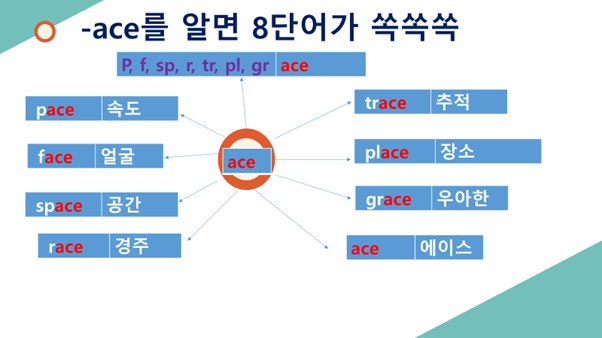 빨간색으로 표시된 ace를 기본 발음으로 보고 각각의 자음들을 변화시키면 새로운 의미의 단어들이 만들어집니다. 위에서 볼 수 있듯이 자음을 변화시키면 pace, face, space, race, trace, place, grace와 같은 단어들이 그것입니다. 이들 단어들은 의미의 연관성보다는 발음의 연관성을 갖는 경우입니다.
